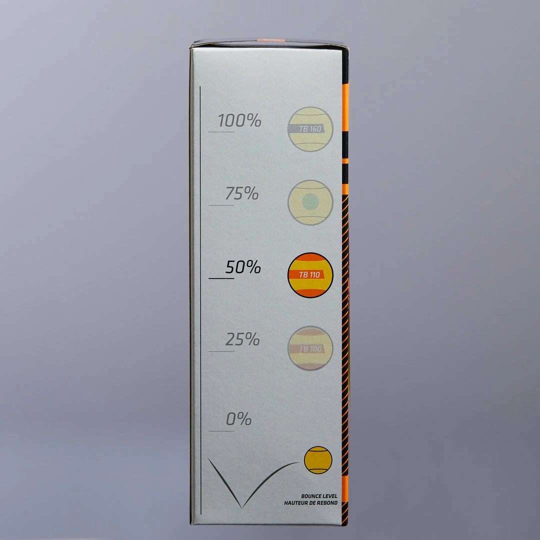 The TB110 has a slower speed and lower bounce – 50% lower than regular balls – making it great for quickly improving your game. It’s between the TB100 (STAGE 3, bounce 75% lower than regular balls), and the TB120 (STAGE 1, bounce 25% lower than regular balls)